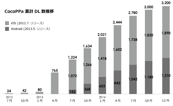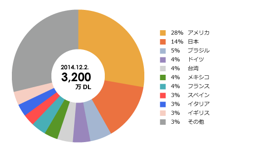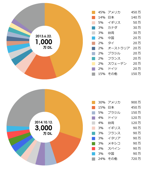 「CocoPPa」Android版リリース後の変化とホームアプリ参入への期待 Android版がリリースされたのが2013年5月で累計1,000万DLいったのが6月。なので1,000万DL突破の数字はほぼiOSと考えてもいいかもしれない。そこから1年数ヶ月経って2014年10月に累計3,000万DL突破した。この間の純増数2,000万の内訳は800万がiOSで1,200万がAndroidって感じ。3,000万DL時はやはりアメリカのシェアが極端に下がってるのがわかります。日本はほぼ変わらない。Android版リリースによって浮上したのがブラジル、ドイツ、台湾。そして、メキシコ、スペインなどのスペイン語圏も伸びてきてる。意外と伸びてないのが中国。もっといくかなって思ってたけど。シェアは2%から3%に伸びてるんだけど。非公式Androidマーケット対策をするともっといきそうだけど、それをするかどうかは何とも。で、CocoPPaは本格的にホームアプリに参戦するようで、つい先日リリースが出てました。これはAndroid市場で勝負をかけてくぞって意思と言えるわけで、アメリカ以外で一気にシェア拡大の可能性あるなーとぼんやり思ったわけです。日本発のグローバルアプリとして頑張って欲しいし、どうなるか楽しみ。■追記12月8日どうやら3,200万DL突破したみたい。やはりアメリカ比率は減ってますね。興味深い。【関連エントリー】・『CocoPPa』をタブレットでも!四半期黒字化ユナイテッドの次の展開・個人的に気に入ってる決算説明会資料(ネット系企業9社)・ユナイテッド株価と『CocoPPa』DL数の相関について http://takanoridayo.blog.shinobi.jp/Entry/337/「CocoPPa」Android版リリース後の変化とホームアプリ参入への期待