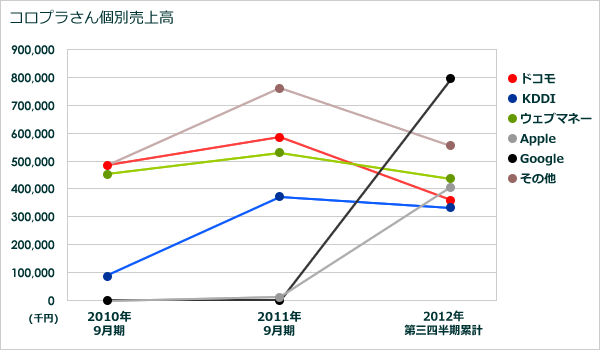 位置ゲーだけじゃない!コロプラさん上場決定(追記あり) 位置ゲーのパイオニアであるコロプラさんがマザーズに上場だそうです。昨期(平成23年9月期)は売上22.8億、経常利益約5.7億だそうです。22年9月よりも売上は飛躍的に伸びていますが、経常利益は減っています。今期はどうなのでしょうか。ちなみに今期の第三四半期累計では29億円くらい売上ています。このままだと40億くらいになりそうですね。【参考】【コロプラ上場】平成23年9月期 売上22.8億、経常利益約5.7億そんなことより、てっきり『コロプラ』のみの会社かと思っていたら、結構ソーシャルゲームもやっているんですね。で、興味深かったのが「相手先別」の売上。今期ドカーンってGoogle、Appleの売上が上がってます。一方ドコモ、KDDIはこのままだと横ばいくらい。モバイル系の世相を表している感じですね。【追記】平成24年9月期は売上約50億円、経常約15億円だそうで、凄い伸びですね!http://www.tokyoipo.com/top/ja/index.php?id=pre&seqid=2026 http://takanoridayo.blog.shinobi.jp/Entry/69/位置ゲーだけじゃない!コロプラさん上場決定(追記あり)