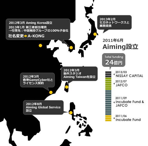 今日の大型資金調達はオンラインゲーム開発のAiming(4回目) 一昨日のメタップス(10億円)、昨日のFreakOut(5億円)と大型資金調達のニュースがありましたが、今日はオンラインゲーム開発のAimingが第三者割当増資を行い、約3億円を調達したとのこと。引受先はニッセイ・キャピタル。2011年に設立したAimingですが、この一年は海外拠点作りなどで精力的に活動しているようです。ゲームもたくさんタイトルが出ていますが、そんな本業よりも話題になっているのが、その資金調達額の大きさです。・2011年6月 3億円(インキュベイトファンド)・2011年9月9日 12億円(インキュベイトファンド ジャフコ)・2012年07月24日 6億円(ジャフコ ジャフコ・スーパーV3共有投資事業有限責任組合)・2013年3月 約3億円(ニッセイ・キャピタル)とこれまで総額24億円を調達しています。す、すごい・・・。それを含めたもろもろについてはサイプロさんの昨夏のエントリーをご覧下さい。>Aiming(エイミング)が設立1年で合計21億円も調達している件さきほどFacebookでAiming社長さんのウォールをコッソリ見てみたのですが、野球が好きそうな、ほのぼのした感じの方だなぁと思いました。まぁそれは置いておいて、資金調達に関しての考えはメタップスさんと同じで、一気に攻めるために調達は必要ってとこだと思います。ゲーム文化の成熟しているアジアでの展開を現地の有力企業などと連携しながらいくってのもなかなか上手いなぁと思ったり。さて、来週も大型資金調達のニュースがあるんですかね。来週はオイシックス、オルトプラスの上場があります。楽しみです。 http://takanoridayo.blog.shinobi.jp/Entry/119/今日の大型資金調達はオンラインゲーム開発のAiming(4回目)