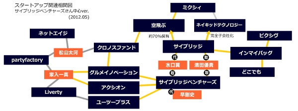 気になったのでサイブリッジさんを少し調べてみた 一昨日サイブリッジさんがネイキッドテクノロジー社の全株をミクシィから買い取ったというエントリーを書いた。以前「スタートアップ投資をふんわり」の際にも相関図にサイブリッジさんを盛り込んだ。『インマイバッグ』の件だったりもあって「最近積極的だなぁ」なんてぼんやり思っていたのですが、実際サイブリッジさんとはお付き合いもなく、あまり知らないので少し調べてみました。もちろん同じ業界に身を置く者としてお名前は以前より知っていましたし、耳にする機会もあった。Webサイトも見たこともあるし、「なかなかきっちり作ってあるサイトだな」なんて思ったりも。でもお取引き無いし、人見知りなので声をかけることも無いので、これまで「ぼんやり」きていたわけです。というわけで相関図を描こうと思ったんだけど、何だかインフォグラフィックみたいになってしまった・・・。基本はシステム開発やWeb制作の「インテグレーション事業」と「メディア事業」の2軸なんだろうけど、メディア・サービスの買収や新業種への参入など、結構積極的なのが改めてわかった次第です。特に最近、個人的に興味があるのがスタートアップ投資の部門。子会社のサイブリッジベンチャーズを通して積極的な投資活動が注目なのです。投資先の一部をあげると、・アクシオン(2011年8月出資:スマホ関連)・グルメイノベーション(2012年2月:『宅麺』運営)・ユーツープラス(2012年2月:『U2plus』運営)など。話題の企業ばかりですね。サイブリッジベンチャーズは取締役にサイブリッジの水口さん、濱田さんが入ってるんだけど、代表には元・美人時計の早剛史さんが就いているんですね。今日知りました。どうでもいいのですが、僕はよくサンブリッジと間違えてしまいます。【おまけ】 http://takanoridayo.blog.shinobi.jp/Entry/21/気になったのでサイブリッジさんを少し調べてみた