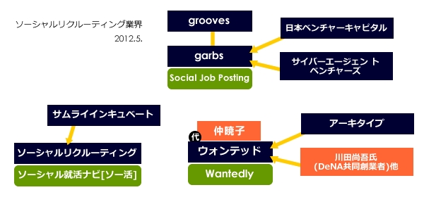 ソーシャルリクルーティング業界を少しだけ調べてみた 昨日Twitter見てたら、サムライインキュベートの榊原さんがこんなツイートをしてまして。【大募集】株式会社ソーシャルリクルーティングで、Webデザイナー・ディレクターやろうぜ!来年IPO一緒にしようぜ!ow.ly/b5QkQ— 榊原健太郎(samurai_ken)さん (@samurai_ken) 5月 23, 2012え?ソーシャルリクルーティングさん、来年IPOするの?と少し驚いた次第です。というわけでソーシャルリクルーティングを少しだけ調べてみました。「ソーシャルリクルーティング」で検索するとだいたい3社くらい出てきます。なので、その3社を。■株式会社ソーシャルリクルーティングhttp://social-recruiting.asia/2011年4月設立『ソーシャル就活ナビ[ソー活]』など、いくつかのFacebookページを立ち上げ活動。中国大手ポータルなどと連携したり、世界・アジアを見据えた展開が特徴。株主でもあるサムライインキュベートの榊原さんが社外取締役として参画。■株式会社garbshttp://garbs.co.jp/2011年1月設立親会社のgroovesは2004年設立の人材会社。人材業界で培ったノウハウを活かして、『Social Job Posting』や技術者SNS『Forkwell』などを展開。CAベンチャーズ、日本ベンチャーキャピタルなども出資。■ウォンテッド株式会社http://wantedly.com2010年9月設立代表の仲さんは元ゴールドマン・サックス証券、米Facebookなど凄い経歴の女性。仲間探しプラットフォーム『Wantedly』を運営。旧来のリクルートサイトの良さを踏襲した使いやすいサービスな気がします。と、3社をざっくりと紹介してみました。人材業界は9兆円市場だそうで、その巨大市場は変革の時がきたのかもしれません。一度使ってみようかしら。ところでKlabさんもソーシャルリクルーティング業界に参入するという話だったけど、どうなったのかな? http://takanoridayo.blog.shinobi.jp/Entry/26/ソーシャルリクルーティング業界を少しだけ調べてみた
