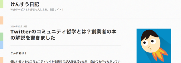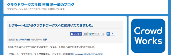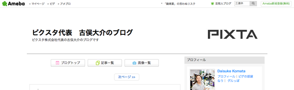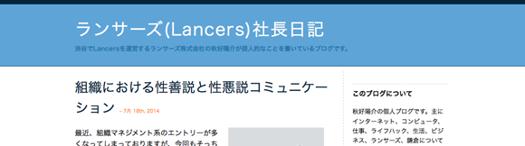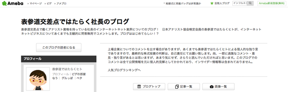 唐突にベンチャー社長ブログをまとめてみた 祝日ということでブログばっか書いてたんですが、ふと思いたって社長ブログをまとめてみました。中には社長じゃない人もいます。社長ブログブームは去ったけど、継続されている方や新たに書き始めた方など、まだまだいっぱい。勉強になります!!サイバーエージェント 藤田さんhttp://ameblo.jp/shibuya/界隈の人なら誰もが知っている藤田さんのブログ。最近の記事も良いけど、個人的には創業当時の日記がグッときます。LINE 森川さんhttp://moriaki.blog.jp/イベントへの参加記録や読書感想などが最近の中心。このブログを見ると森川さんが積極的にベンチャーイベントに参加していることがわかります。忙しそう。GMOインターネット 熊谷さんhttp://www.kumagai.com/昔から書いてるブログ。最近はツイートやFacebookの投稿まとめが主。時折オリジナル記事も投稿されます。nanapi 古川さんhttp://blog.livedoor.jp/kensuu/けんすうさんのブログ。面白い記事ばかりでみんなも知ってると思います!勉強になる。metopes 佐藤さんhttp://katsuaki.co/佐藤さんの頭の中を垣間見ることができるブログ。長文で哲学的な部分もありますが、何度も読むうちに何となく未来が見えてくるかもしれません。ユナイテッド 金子さんhttp://blog.united.jp/yozo/ユナイテッドの金子さんのブログ。ユナイテッドの決算説明や折々のイベントのことが中心です。ベンチャー経営を感じることができます。ランサーズ 秋好さんhttp://www.web-20.net/2005年11月から続くブログ。すごい!歴史の勉強にもなるし、なによりベンチャー経営の歴史を知る事ができて良いです。ピクスタ 古俣さんhttp://ameblo.jp/dkomata/最近よくソーシャル上で見かけるピクスタ古俣さんのブログ。スタートアップ経営者にとって有益な情報やピクスタ創業記など。GMOペパボ 佐藤さんhttp://kentarow.com/ペパボのケンタロさん。かわいいテンプレがペパボらしい。内容は経営に関することや社長業が多め。プチの方も好き。オプト 鉢嶺さんhttp://www.opt.ne.jp/column/ceo/オプトに関する事やベンチャー経営について興味深い記事を更新しています。大人のブログという感じです。リブセンス 村上さんhttp://murakami.livesense.co.jp/先日から始まった村上さんのブログ。これまでSNSなどもほとんど発信してこなかっただけに注目を集めています。今後が楽しみ。ヴォラーレ 高橋さんhttp://hisho-tk.com/ヴォラーレの飛翔さんのブログ。東大法学部卒だけあり、文章がとても上手い。昔から思ってました。Fringe81 田中さんhttp://www.fringe81.com/blog/Fringe81の田中さんのブログも投稿される度にSNSでよく見かける。経営の事や書評など。Mynet 上原さんhttp://www.ceonews.jp/「アルファブロガー」としても知られる上原仁さん。昔から読んでたブログです。直近の記事は相当バズってました。ベーシック 秋山さんhttp://forward.basicinc.jp/比較サイトがメインだった頃からベーシック社を見てたのですが、当時あったマンガでの創業期をもう一度見たいなと。社長ブログはなかなかためになります。セレス 都木さんhttp://ameblo.jp/netanalyst/先日IPOしたセレスの社長ブログ。決算系の記事が多く、とても勉強になります。クラウドワークス 吉田さんhttp://crowdworks.jp/ceo-blog/先日上場承認がおりたクラウドワークス吉田さんのブログ。イベントの振り返りや社員にあててなどスタートアップ経営者感あるブログです。コイニー 佐俣さんhttp://www.paymentgeek.net/コイニー奈緒子さんのブログ。これは非常に良いブログで、更新される度に読み、考えさせられています。ウォンテッドリー 仲さんhttps://www.wantedly.com/users/8558/blogsウォンテッドリー仲さんのブログ。スタートアップ経営者必見の内容。得意のマンガやイラストもたまに出てきます。チケットストリート 西山さんhttp://ashikagunso.blog.jp/「軍曹」としても界隈で有名なチケスト西山さんのブログ。幅広い見識から書かれるブログは昔から好きで読んでいました。ファンコミュニケーションズ 柳澤さんhttp://d.hatena.ne.jp/ankeiy+news/「ヤナティ」としても界隈で有名なファンコミ柳澤さんのブログ。「ブログを書く熱意を失った」と書かれていれ寂しい限りですが、面白いブログです。メルカリ 山田さんhttp://suadd.com/wp/メルカリ進太郎さんのブログ。書評中心ですが、詳しい解説と感想で勉強になります。本好きの方はぜひ。DeNA 南場さんhttp://ameblo.jp/nambadena/更新が止まっていますが、かつては人気ブログとして多くの人に読まれていたブログ。とても文章がうまく、またためになる内容です。BASE 鶴岡さんhttp://tsuruoka.com/BASE鶴岡さんのブログ。まだあまり記事無いですが、今後の更新が楽しみ。trippiece 石田さんhttp://ishidaian.tumblr.com/trippiece石田言行さんのブログ。スタートアップ経営者の息づかいを感じることができます。East Ventures 松山太河さんhttp://tiger-note.blogspot.jp/太河さんのブログ。Facebookなどで書いたものの中から大事なものなどをピックアップしたりしてます。ブログタイトルが良いですよね。 http://takano