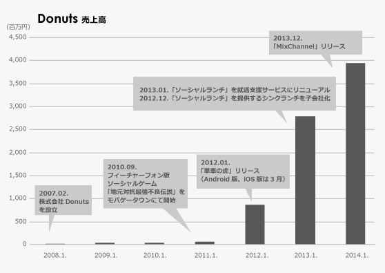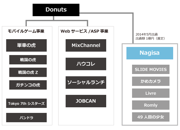 ヤンキーだけでなく普通の若者も「MixChannel」で取り込んだ好調Donutsと「累計700万DL」の出資先Nagisa セルリアンの向かい側を歩いてると「株式会社Donuts」って表札がかかってるビルがあって、「あぁここにDonuts入ってるんだなぁ。一度行ってみたいなぁ。」と思いながら通り過ぎたり、同じビルに入ってるKauliに遊びに行ったりしてたのですが、Donutsさん代々木に移転したんですね。うぐぐ。そんなDonutsですが、3月にも一度調べたんだけど、業績は好調です。前回は「単車の虎」について調べたんだけど、最近はゲーム以外も好調そうです。Donutsはモバイルゲーム事業とWebサービス事業、ASP事業の3つの事業があるのですが、最近好調そうなのがWebサービス事業。その中でもやっぱり注目なのが「MixChannel」です。先日TechCrunchにも記事が上がってましたが、月間再生回数2億3千万回って凄い。この先どこまで伸びるのやら・・・。そしてなにげに凄いなって思ったのが「ハウコレ」。月間6,000万PVを超えてる。相当なメディア。あと気になるのが、5月にDonutsが出資したNagisaの勢い。今年の8月に累計700万DLを突破したそうで、それから約4ヶ月経ったので1,000万DL超えてるかもしれない。先日イグニスを調べたけど、Nagisaの戦略はそれに近い感じもする。好調なDonuts、Nagisa連合はWeb、アプリ両面でチェックし続けないといけなそうですね。【関連エントリー】・「単車の虎」になるには速さだけでなく、粘り強さも必要だと再認識したDonuts・2014年IPOしそうな会社 「ド素人」予測・イグニスの決算説明会資料がいろいろ勉強になった http://takanoridayo.blog.shinobi.jp/Entry/334/ヤンキーだけでなく普通の若者も「MixChannel」で取り込んだ好調Donutsと「累計700万DL」の出資先Nagisa