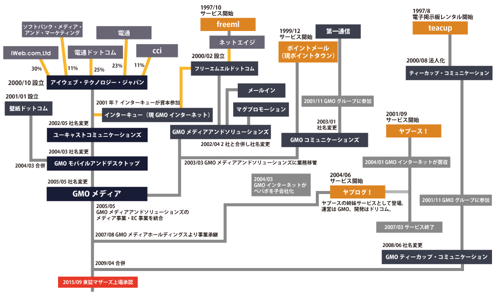 「teacup」「ヤプログ!」のGMOメディアが上場するらしいので沿革を図にしてみたよ GMOグループの一つGMOメディアに上場承認がおりたましたね。GMOグループ9社目だそうです。いやーすごい。GMOメディアは個人的にはとても馴染みの深い会社であり、森社長とは2006年に練馬の居酒屋で飲んで以来たまにお会いさせて頂いたりしており、感慨深い。森社長については加藤ポールさんのブログに詳しく載ってるのでぜひ。※クリックすると大きな画像が見られます。GMOメディアはその名の通りGMOグループのメディア系サービスを主に運営してるのですが、その中には誰もが一度は使ったことがありそうな「teacup」や「ヤプログ!」「freeml」などがありノスタルジック。またSEO界隈でたまに話題になる「プリキャン」も運営。そんなGMOメディアの沿革?を図にしてたのですが、どうにも横長になってしまいまして・・・。いやしかし歴史が詰まった会社ですね。【関連エントリー】・ネットベンチャー8社の創業の頃のコーポレートサイトとかをInternet Archiveで見てみたら懐かしかったよ・今から16年前「1999年ビットバレー」ベンチャー地図を描いてみた・今年上場して時価総額5,000億円以上の王者GoDaddyと猛追する中国レジストラ http://takanoridayo.blog.shinobi.jp/Entry/426/「teacup」「ヤプログ!」のGMOメディアが上場するらしいので沿革を図にしてみたよ