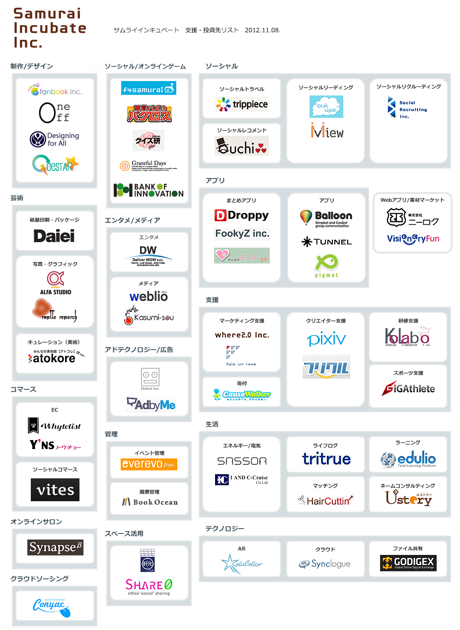 サムライインキュベートさんを調べてみた enish上場とかcygamesにDeNAが資本参加とかグリーとヤフーの提携とかソシャゲ界隈が盛り上がってますが、そこにはあえて触れず、サムライインキュベートさんについて調べてみました。サムライインキュベートさんはもう今や説明不要のスタートアップ投資をメインにやっている会社さまで代表の榊原さんは日夜世界を飛び回っていて、きっとあの方は寝ていないんだろうなと思っています。去年の4月に並木橋の辺りのビルで雨の中開催された第二回SVSにパネリストとして参加しまして、それ以来、SSIにお邪魔したりさせて頂いたりしております。ちなみにそのパネルディスカッションですが、「サムライが社名につく会社がサムライについて語る」的なものでして、司会は僕もいつも拝見させて頂いている『The Startup』のUmekiさんだったと思います。かなり時間が押して、駆け足でパネルディスカッションをやったなぁと記憶しています。そもそも最初、お客としてSVSに参加しようと思って参加費も払っていたのですが、友達から「takanoriさん、パネルディスカッション出るんですね!」って教えられてWebサイトを見たらパネラーに名前がありまして驚いたという思い出が。今やSVSも世界規模で開催されていて、その成長ぶりには驚かされます。サムライインキュベートさんに関しては上記『The Startup』にも詳しい記事がありますので、そちらをぜひともご覧頂ければと。サムライインキュベートさんのサイトの「私達のお客様」というページに支援、投資先のロゴがあるのですが、そこにあるだけで56社もあります。投資先だけでなく、何らかの事業提携などの会社さまも含まれているみたいですが、それにしても多い。そしてジャンルがかなりバラエティにとんでいます。一応カテゴリ分けしてみたんですが、どうにも上手くいかなくて、こんな感じになってしまいました。しかも、一つの会社が複数の事業ドメインを持っている場合も当然あるので、あくまで参考まで。サムライインキュベートさんを知ったきっかけは「軒先」さんの記事をどこかで見たことです。面白いビジネスだなぁって。今回調べて印象深かったのは「Ustory」さんです。かつて榊原さんに投資先を選ぶポイントをちょっと聞いたのですが、「一過性のものではなく、文化になるような事業をやっている会社は応援したい」といった趣旨の事を仰っていたのですが、弊社の企業理念「色あせない“文化”をつくり出すことで、すべての人に感動と幸せを」とコンセプトは似てるのかなと思ったり。やはりサムライ繋がりですからね。今はイスラエルにいるっぽいですが、サムライインキュベートさんにはこれからも注目です。※以下、わかる範囲ですが、URLを載せておきます。サムライインキュベートさんのサイトからも投資先サイトへリンクがつくといいなぁ。【制作デザイン】http://www.fanbook.co.jp/http://www.one-off.biz/http://questar.ac/【芸術】http://www.daieishikou.co.jp/http://www.alfa-studio.co.jp/http://rosette-research.com/jp/whatWeDo.htmlhttp://atokore.com/【コマース】http://whytelist.com/http://www.ynstokyo.co.jp/http://gigocean.com/【オンラインサロン】http://synapse.am/【クラウドソーシング】https://conyac.cc/【ソーシャル/オンラインゲーム】http://www.f4samurai.jp/http://www.puzzlegame.jp/http://atamasoft.jp/http://gdays.jp/http://www.boi.jp/【エンタメ/メディア】http://www.deliver-wow.com/http://www.weblio.jp/http://kasumi-sou.co.jp/【アドテクノロジー/広告】http://jp.ad-maker.net/https://adby.me/【管理】http://everevo.com/http://book-ocean.com/【スペース活用】http://www.nokisaki.com/http://www.share0.net/【ソーシャル】http://www.trippiece.co.jp/http://www.quchi.jp/http://bukupe.com/http://www.miew.co.jp/http://social-recruiting.asia/【アプリ】http://droppy.jp/http://fookyz.com/http://minnanodate.com/http://balloon.am/http://www.tunn-el.com/http://pigmal.com/http://i26.jp/http://www.visionary-fun.jp/【支援】http://www.samurai-incubate.asia/where2.0/http://www.faisunreve.co.jp/http://www.dimers-lab.com/http://www.pixiv.net/http://frekul.com/http://crew-world.com/http://gigathlete.com/【生活】http://www.sassor.com/http://www.iacc.co.jp/http://www.logtown.me/http://haircuttin.com/http://www.edulio.com/http://www.ustory.jp/【テクノロジー】http://www.rei-frontier.jp/http://www.synclogue.com/http://godigex.com/ http://takanoridayo.blog.shinobi.jp/Entry/68/サムライインキュベートさんを調べてみた