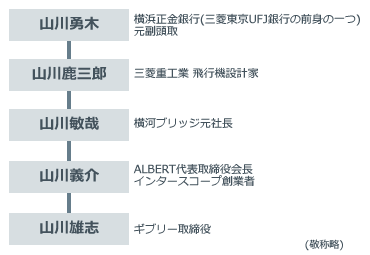 華麗なる一族は羨ましい反面、僕にはプレッシャーに耐えられない 居酒屋「天狗」でランチ。料理が出てくる間に天狗調べたけど、創業者兄弟凄い。弟の一人は「セコム」創業者、他の弟は「オーケーストア」創業だって。— 大柴貴紀 Takanori Oshibaさん (@takanori1976) 12月 2, 2012先日何気なく入った居酒屋「天狗」で注文が出てくる間に調べたら「天狗」創業者の方の兄弟が凄くて。5人兄弟で長男は家業を継ぎ、次男が「天狗」を創業、三男が「オーケーストア」、四男の方は体が弱かったらしいので情報は無く、そして末っ子の五男がセコム創業者。この件の動画がありました。定岡三兄弟も真っ青ですよ。そういえば孫兄弟もいるし、意外と探せばいるのかもしれないですね。孫さんもお父さんが経営者でしたよね。経営者の父を持つと子供もそういう道に行く確率も高そうな気がします。ところで先日の「アドテクとビッグデータの融合というわけで、DACがALBERTを持分法適用会社に」というエントリーをALBERTの社長さんがツイートして頂いたので改めてALBERTさんのコーポレートサイトを見てみたら、会長の山川さん経歴やら一族やらがなかなか凄かったです。理系色が強い。ギブリーさんが先日コーポレートサイトをリニューアルしたという話題がTLに上がってて見てて「山下さんって取締役の方、他の役員と比べて若いなぁ」と思っていたのでビックリしました。ちなみにギブリーさん、ウチのオフィスの隣の隣の隣のビルくらいにあります。ところで、ALBERT山川さんは関東学院大学人間環境研究所客員研究員をやられているみたいですが、人間環境学部なんてできたんですね。僕が通ってた時には無かったなぁ。ところでwikiですが、おそらくご本人様が更新をしていると思うのです。情報が詳細です。 http://takanoridayo.blog.shinobi.jp/Entry/78/華麗なる一族は羨ましい反面、僕にはプレッシャーに耐えられない