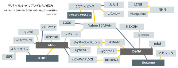 「KDDIの目はヒルズからヒカリエに移っているかもしれない」なんて妄想したり ※クリックすると大きな画像が。「グリーとヤフーがソシャゲの会社作るなんて、最近仲良いな。」なんて思っていたのですが、翌日ドドンとビッグニュースが。KDDI:保有するグリー株の半数売却へ、発行済みの3.4% (ブルームバーグ)グリー躍進のきっかけとなったKDDIとの資本業務提携から6年半。Kei Nishiyamaさんのツイートによると「KDDIのグリー株取得価格は364百万円。半分の800万株を今日の終値1154円で売ると約90億円の利益か…」とのこと。とは言え2006年の提携はお互いにとってどちらも大きな利益をあげる事ができたので最高の戦略だったでしょうね。しかし、今回の一件をタイムラインで見ると、2月12日:KDDI、大和証券とグリー株の売買委託契約(発行済み総数の3.4%)2月12日:グリー、第2四半期決算発表2月18日:グリー、自社株買い(発行済み総数の1%を上限)発表2月18日:グリー、ヤフーと共同会社設立発表2月19日:KDDI、グリー株売却の方針を発表・・・これはさすがにKDDIしたたかだなぁと。オトナだなぁと。でもオトナと言えばヤフーですよ。今回の件は携帯キャリア同士の勢力争いにも見えなくもないけど、ソフトバンクグループのヤフーはKDDIが大株主のグリーともdocomoと提携しているDeNAとも提携している。過日の英国のような振る舞いにも見えるけど、最終的にSBの利益の為に動くわけで、グリーをSB陣営に取り込む方向に動いているのかもしれない。そうなったらそれはそれでKDDI陣営はネガティブな影響が出そうなので、全株売らないで、半分取っておくって感じでしょうか。(妄想終わり)そして、改めてソフトバンクの強大さを感じたわけです。業績もそうですが、株価も爆騰中のガンホーの株の33%を保有しているのはソフトバンク(BB)・・・。ちょっと株価が上がり過ぎな気もしますけど(サイプロさんもこんなエントリーを「ガンホー(パズドラ)の時価総額がグリーより高いのは正直おかしいと思う」)株価ってよくわからないので、しばらく眺めていたいと思います。今回、相関図を少しいじってみましたが、KDDIはNHN方面と提携しそうな予感がしてなりません。SB、 docomoが手をつけていて、KDDIがまだ手をつけてない分野をNHNはカバーする。最も飛ぶ鳥を落とすNHNがどこか特定のとこと組むかはわからないけど。そしてdocomoはついにiPhoneを!?【追記】LINEの舛田さんに「妄想だ!」とFBで言われたので、妄想かもしれません<タイトル--------------【関連してそうなエントリー】・巷では「ガン砲」と言うらしい"パズドラ"ガンホーの超絶決算とラグナロクの健闘・【追記・タイトル修正】ドコモ→マガシーク、楽天→スタイライフをそれぞれTOBでファッションEC界隈が再編・docomoの事業領域から次の買収先を妄想したり・マガシーク、スタイライフ、スタートトゥデイを比較して改めてZOZOの強さを知った夜 http://takanoridayo.blog.shinobi.jp/Entry/109/「KDDIの目はヒルズからヒカリエに移っているかもしれない」なんて妄想したり