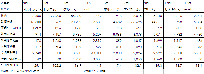 【祝IPO】オルトプラスさんと競合SAPのPERなどをざっくり比べてみた 昨日IPOをしたオイシックスは一時は時価総額200億円超えをみせるなど人気でしたが、本日IPOしたオルトプラスも人気で、最終的に一株3,450円の買気配で明日をむかえるといった感じのようです。昨期実績の売上高や昨今のソシャゲ苦戦の噂などを鑑みて「どれくらい値がつくのだろうか。あまりいかないのではないか・・・」と思ってたのですが、フタを開けてみたら想像以上でした。これがアベノミクスというやつなのでしょうか。というわけで『Social Game Info』にオルトプラスの競合として載ってた8社を加えた簡単な比較をしてみました。※クリックすると大きくなるよまぁ昨期実績で比べるとオルトプラスの売上規模は小さいけど、今期予測で比べると、特に利益面では他社とひけをとらないくらいですね。実績から見ると「PER100倍超えってwww」と思ったけど、意外と適正価格なのかもしれないなぁって思ったり。蛇足ですが、上記の表から昨期実績ベースのPERと今期予測のPERだけ抜き出してみました。むむむ。オルトプラスのPERもぐぐっと普通っぽい数値になりますね。竜石堂さん、ご馳走様です。------------------------------【関連エントリー】・2013年IPOしそうな会社 「素人」予測・オイシックスIPO ライバルはクックパッド?! http://takanoridayo.blog.shinobi.jp/Entry/122/【祝IPO】オルトプラスさんと競合SAPのPERなどをざっくり比べてみた