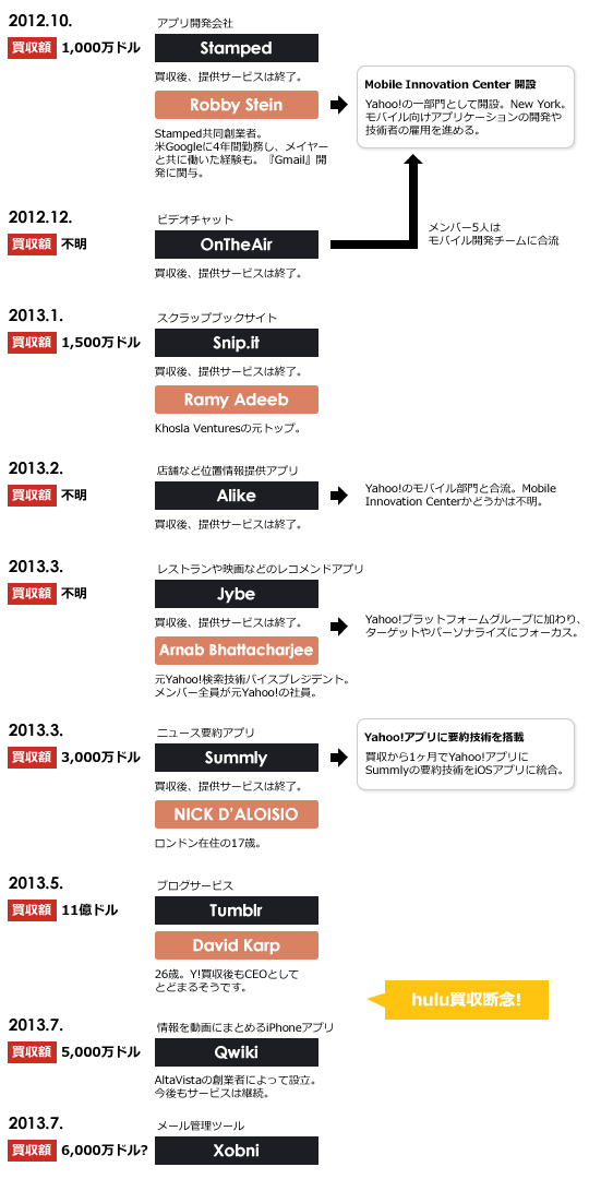 【追記あり】米ヤフーCEOにメイヤーさんが就任してからの買収をまとめてみた 米Yahoo!が『Qwiki』を買収ってニュースがあったので、メイヤー女史が就任した去年の7月からの買収案件をまとめてみました。しかし、インフォグラフィックス並に大きくなってしまった・・・。サムネをクリックすると大きくなります。これみてわかるけど、買ったサービスはすぐさま終了させているんですね。TumblrとQwikiはこれからも継続するみたいですが。この二つの買収はサービスの買収で、他の案件は技術であった人材であったりということですかね。特にモバイル分野に関しては相当前のめりで人材やら技術やらを集めている感じ。正しいと言えば正しい。日本でも今後こういった人材・技術を確保するための買収って増えてきそう。※追記(13:00)新たにXobniを買収したというので図を修正しました。http://jp.techcrunch.com/2013/07/04/20130703yahoo-acquires-xobni/【関連エントリー】・今、世界で最も影響力のあるTech系女性はFacebookのサンドバーグ女史・増え続ける情報に対しての新たな提案『Summly』を米ヤフーが買収・マリッサ・メイヤーは真の博打打ち http://takanoridayo.blog.shinobi.jp/Entry/172/【追記あり】米ヤフーCEOにメイヤーさんが就任してからの買収をまとめてみた