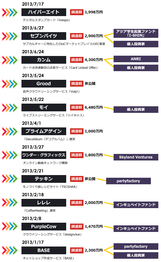 今年に入ってからのEast Venturesの投資先を調べてみた 先日TLに流れてた「僕がエンジェル投資家になったわけ」という記事はとてもオモシロかったのですが、その松山太河さん率いるEast Venturesが本日デジタルスタンプカード『mespo』運営のハイパーエイトに出資したそうです。>デジタルスタンプカード「mespo」運営のハイパーエイト、イーストベンチャーズに1998万円の第三者割当増資を実施デジタルスタンプカードとはスマホで店舗のスタンプを貯められるよ、っていうサービス。スタンプカードってすぐなくしちゃうし、財布から出すのがめんどくさかったりするので、これはなかなか良いサービスなんじゃないかと。先日出資したカンムであったり、昨年出資したコイニーであったり「スマホ×店舗」などの分野に投資してる感じ。あとは動画。今年に入ってからのEast Venturesによる国内投資をピックアップしてみました。抜け漏れあるかも・・・。どれも注目の企業。さすがの眼力。【関連エントリー】・中高生から政治家、芸能人、ブラジルの皆さんなどたぶん想定外の拡大をみせる『ツイキャス』を作った御方が凄い・CLOサービスのカンムが増資した件とクレディセゾン周りの話・投資先がとてもユニークな(気がする)Skyland Ventures http://takanoridayo.blog.shinobi.jp/Entry/178/今年に入ってからのEast Venturesの投資先を調べてみた