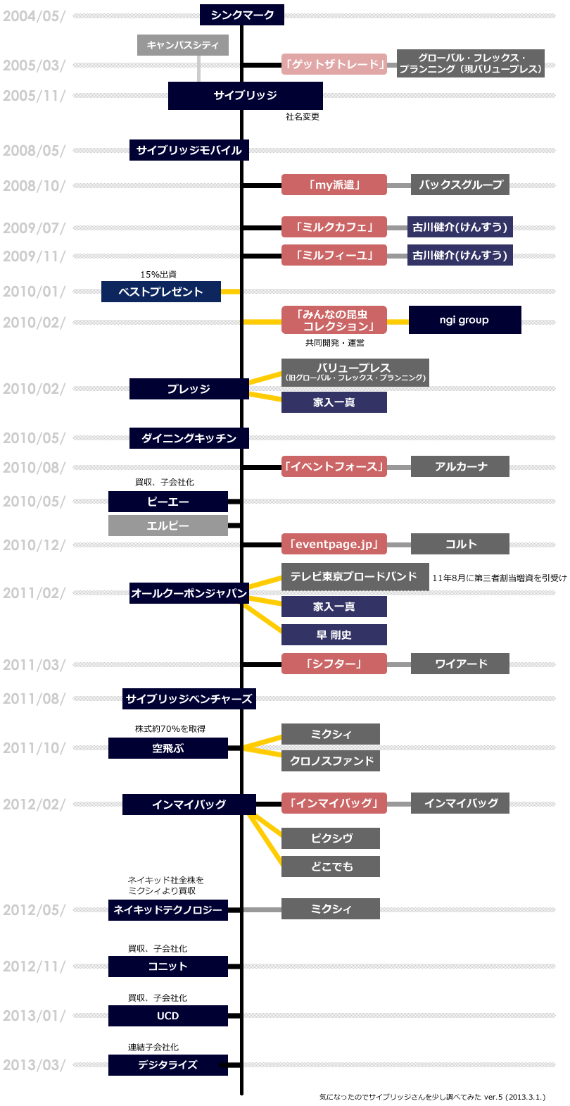 気になったのでサイブリッジさんを少し調べてみた 一昨日サイブリッジさんがネイキッドテクノロジー社の全株をミクシィから買い取ったというエントリーを書いた。以前「スタートアップ投資をふんわり」の際にも相関図にサイブリッジさんを盛り込んだ。『インマイバッグ』の件だったりもあって「最近積極的だなぁ」なんてぼんやり思っていたのですが、実際サイブリッジさんとはお付き合いもなく、あまり知らないので少し調べてみました。もちろん同じ業界に身を置く者としてお名前は以前より知っていましたし、耳にする機会もあった。Webサイトも見たこともあるし、「なかなかきっちり作ってあるサイトだな」なんて思ったりも。でもお取引き無いし、人見知りなので声をかけることも無いので、これまで「ぼんやり」きていたわけです。というわけで相関図を描こうと思ったんだけど、何だかインフォグラフィックみたいになってしまった・・・。基本はシステム開発やWeb制作の「インテグレーション事業」と「メディア事業」の2軸なんだろうけど、メディア・サービスの買収や新業種への参入など、結構積極的なのが改めてわかった次第です。特に最近、個人的に興味があるのがスタートアップ投資の部門。子会社のサイブリッジベンチャーズを通して積極的な投資活動が注目なのです。投資先の一部をあげると、・アクシオン(2011年8月出資:スマホ関連)・グルメイノベーション(2012年2月:『宅麺』運営)・ユーツープラス(2012年2月:『U2plus』運営)など。話題の企業ばかりですね。サイブリッジベンチャーズは取締役にサイブリッジの水口さん、濱田さんが入ってるんだけど、代表には元・美人時計の早剛史さんが就いているんですね。今日知りました。どうでもいいのですが、僕はよくサンブリッジと間違えてしまいます。【おまけ】 http://takanoridayo.blog.shinobi.jp/Entry/21/気になったのでサイブリッジさんを少し調べてみた
